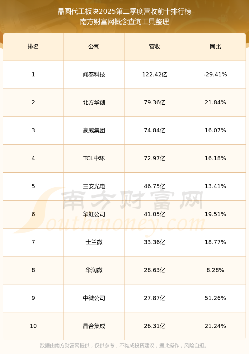 按照南方財富網(wǎng)概念查詢工具統(tǒng)計,該股所屬板塊為晶圓代工板塊,該板塊共有35只股票,晶合集成2025第二季度營收在該板塊中排名為第10名,該板塊2025第二季度營收排名前十的股票如下表: