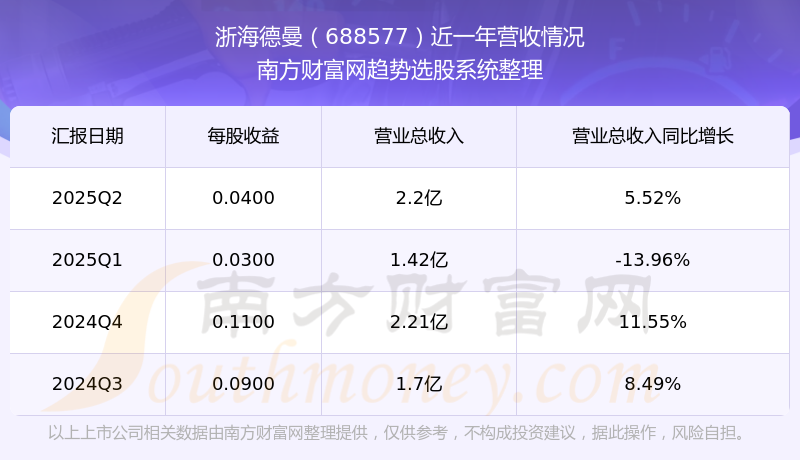 浙海德曼(688577)披露2025年第二季度報告,報告期實現(xiàn)營收2.2億元,同比5.52%;歸母凈利潤594.2萬元,同比-27.02%;扣非凈利潤351.65萬元,同比-52.15%;基本每股收益0.04元。