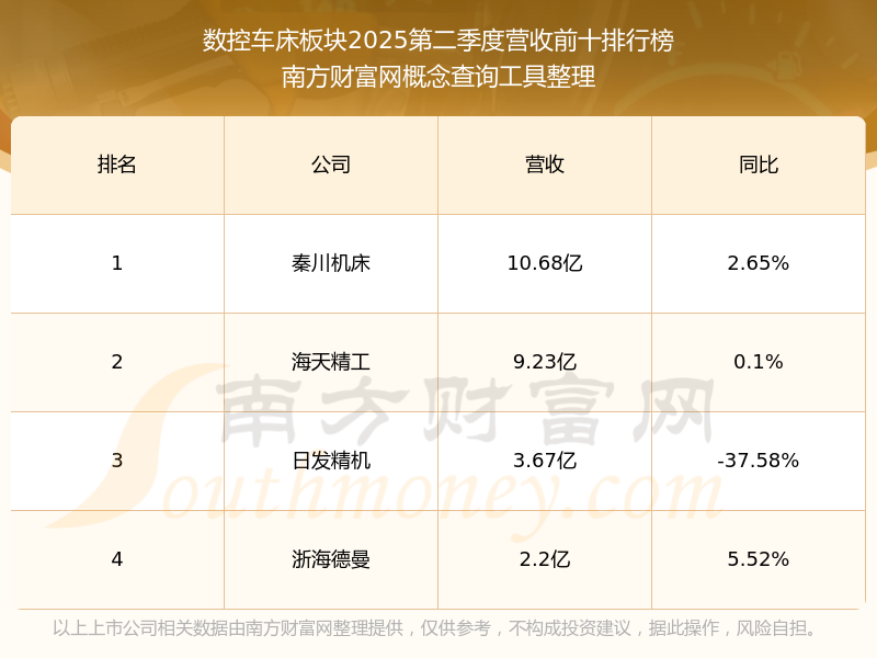 按照南方財富網(wǎng)概念查詢工具統(tǒng)計,該股所屬板塊為數(shù)控車床板塊,該板塊共有4只股票,浙海德曼2025第二季度營收在該板塊中排名為第4名,該板塊2025第二季度營收排名前十的股票如下表: