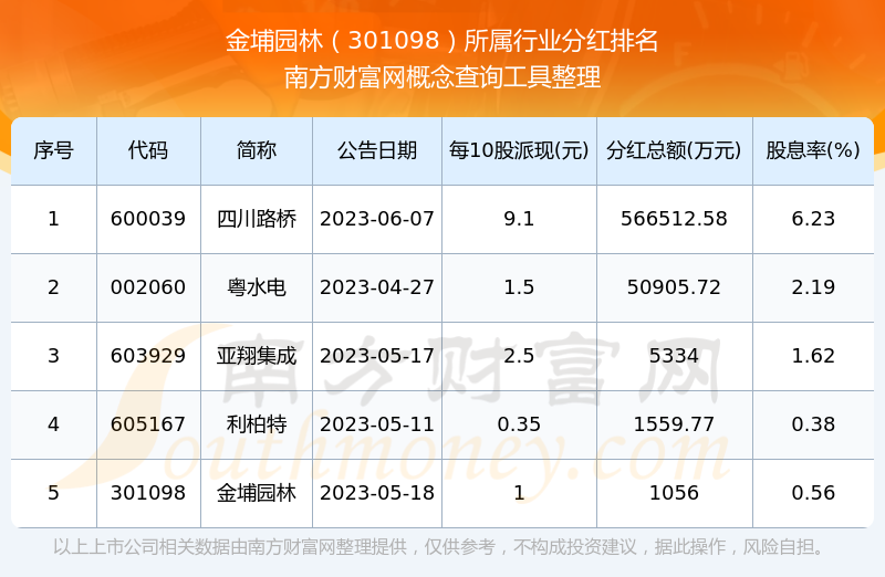 按照南方財富網(wǎng)趨勢選股系統(tǒng)統(tǒng)計,金埔園林所屬行業(yè)為工程施工行業(yè),工程施工行業(yè)分紅排名情況如下表: