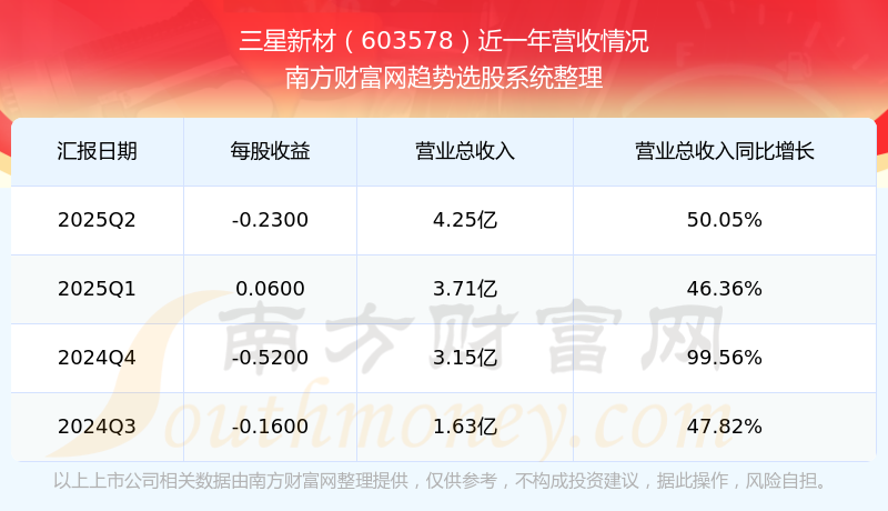 三星新材(603578)披露2025年第二季度報(bào)告,報(bào)告期實(shí)現(xiàn)營(yíng)收4.25億元,同比50.05%;歸母凈利潤(rùn)-4052.82萬元,同比-212.93%;扣非凈利潤(rùn)-4162.69萬元,同比-216.2%;基本每股收益-0.23元。