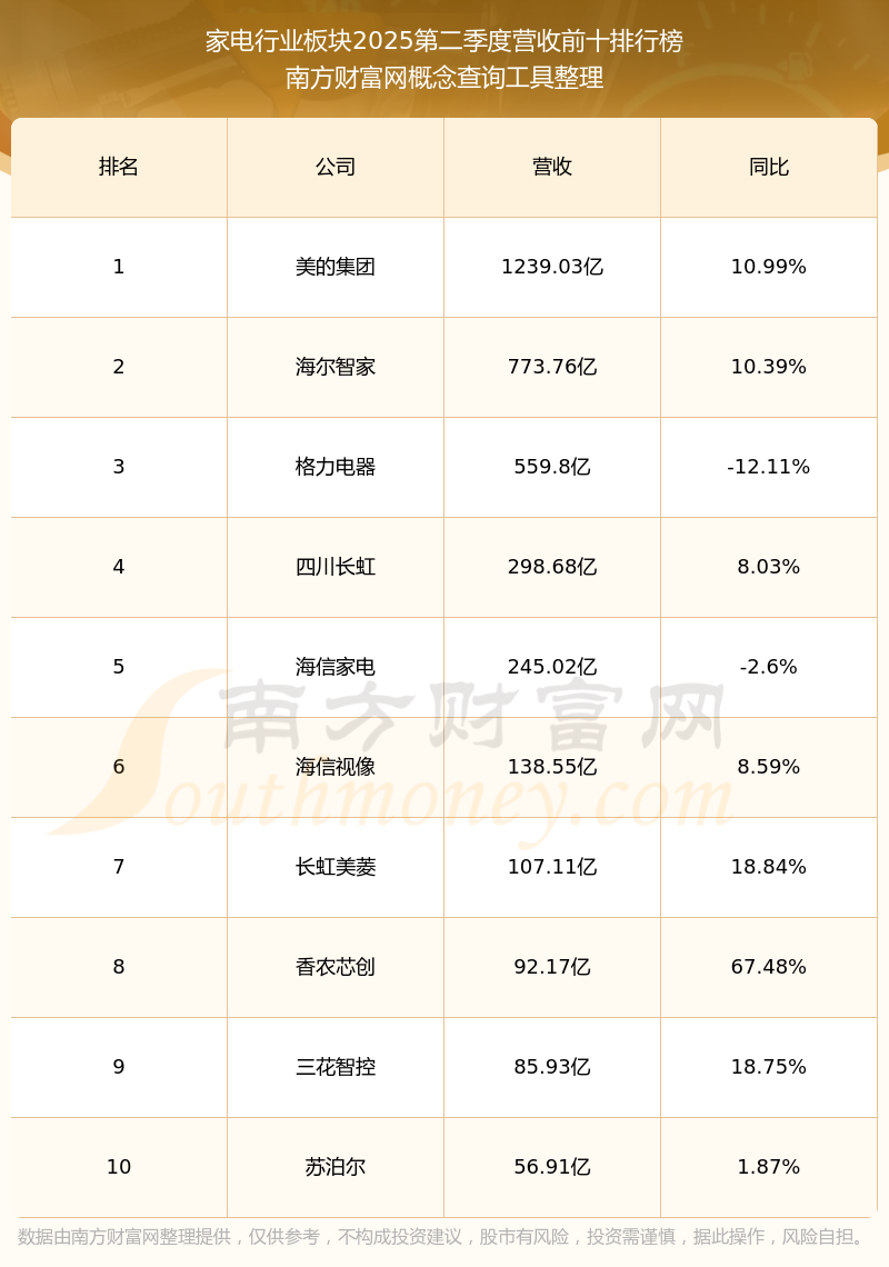 按照南方財(cái)富網(wǎng)概念查詢工具統(tǒng)計(jì),該股所屬板塊為家電行業(yè)板塊,該板塊共有64只股票,三星新材2025第二季度營(yíng)收在該板塊中排名為第64名,該板塊2025第二季度營(yíng)收排名前十的股票如下表: