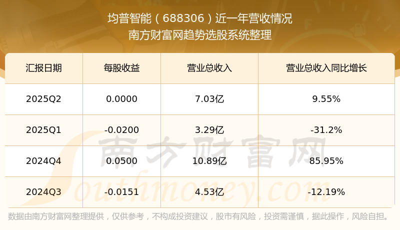 均普智能2025年第二季度顯示,公司主營(yíng)收入7.03億元,同比9.55%;歸母凈利潤(rùn)239.79萬(wàn)元,同比-69.57%;扣非凈利潤(rùn)59.01萬(wàn)元,同比105.7%。