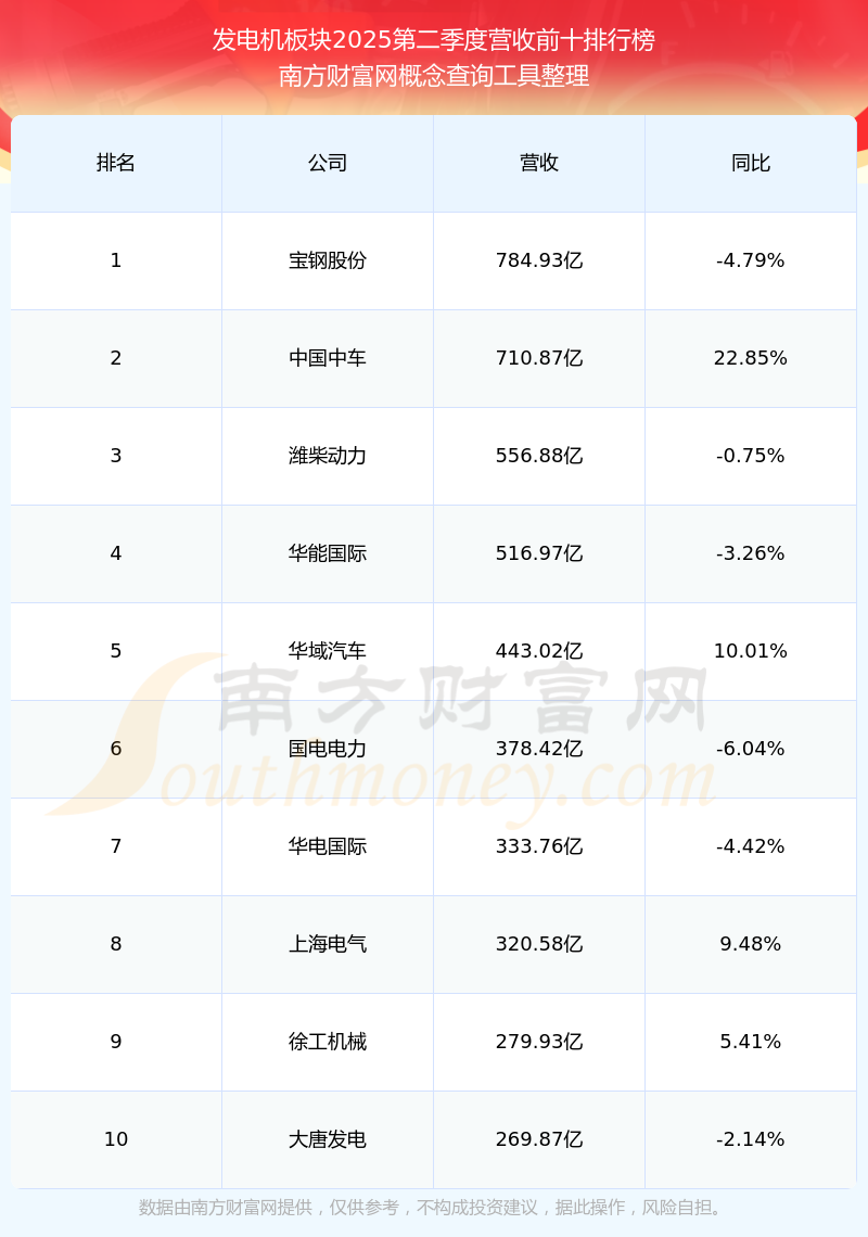 按照南方財(cái)富網(wǎng)概念查詢工具統(tǒng)計(jì),該股所屬板塊為發(fā)電機(jī)板塊,該板塊共有149只股票,德宏股份2025第二季度營收在該板塊中排名為第134名,該板塊2025第二季度營收排名前十的股票如下表: