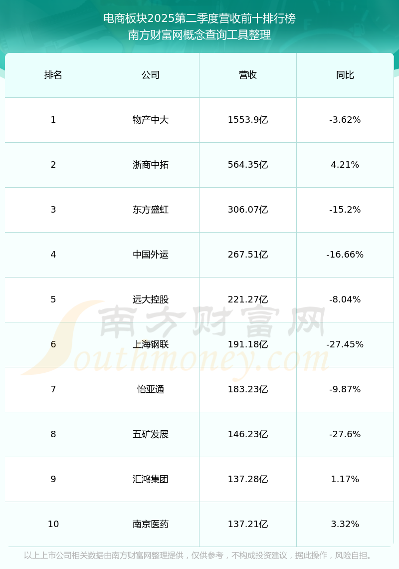 按照南方財富網(wǎng)概念查詢工具統(tǒng)計,該股所屬板塊為電商板塊,該板塊共有231只股票,獅頭股份2025第二季度營收在該板塊中排名為第213名,該板塊2025第二季度營收排名前十的股票如下表: