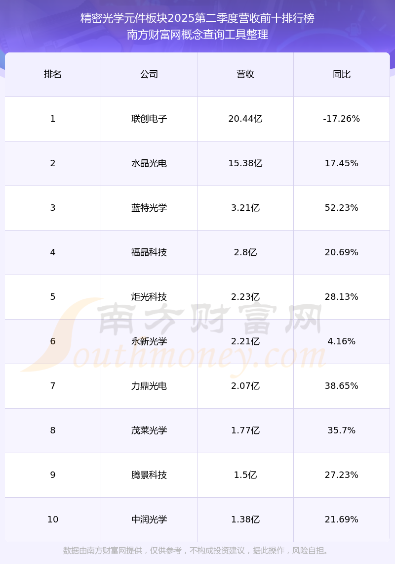 按照南方財(cái)富網(wǎng)概念查詢工具統(tǒng)計(jì),該股所屬板塊為精密光學(xué)元件板塊,該板塊共有12只股票,騰景科技2025第二季度營(yíng)收在該板塊中排名為第9名,該板塊2025第二季度營(yíng)收排名前十的股票如下表: