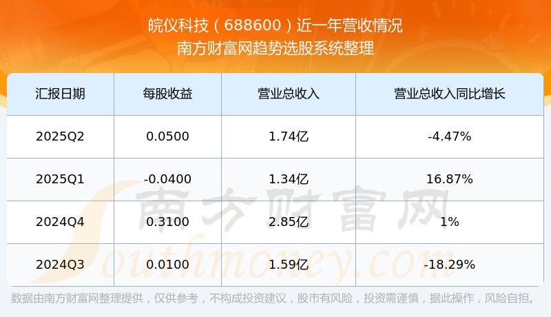 皖儀科技(688600)披露2025年第二季度報告,報告期實現(xiàn)營收1.74億元,同比-4.47%;歸母凈利潤649.8萬元,同比36.74%;扣非凈利潤414.4萬元,同比63.38%;基本每股收益0.05元。