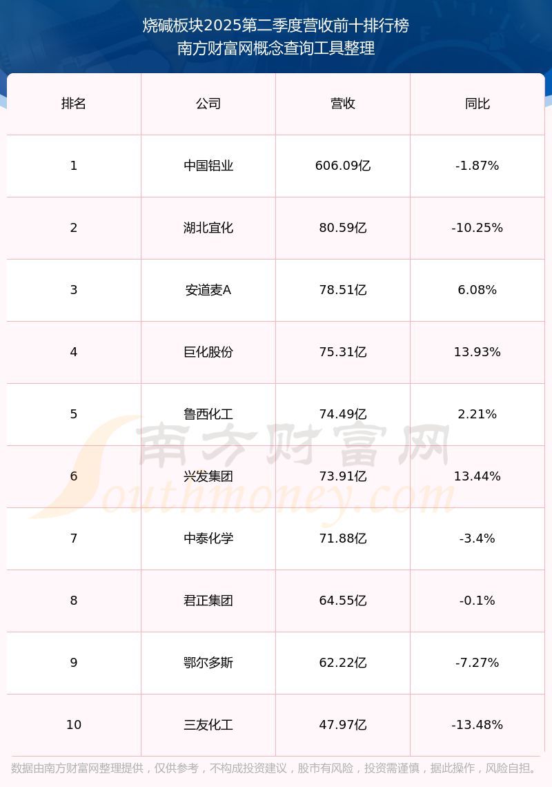 按照南方財富網概念查詢工具統(tǒng)計,該股所屬板塊為燒堿板塊,該板塊共有38只股票,氯堿化工2025第二季度營收在該板塊中排名為第19名,該板塊2025第二季度營收排名前十的股票如下表: