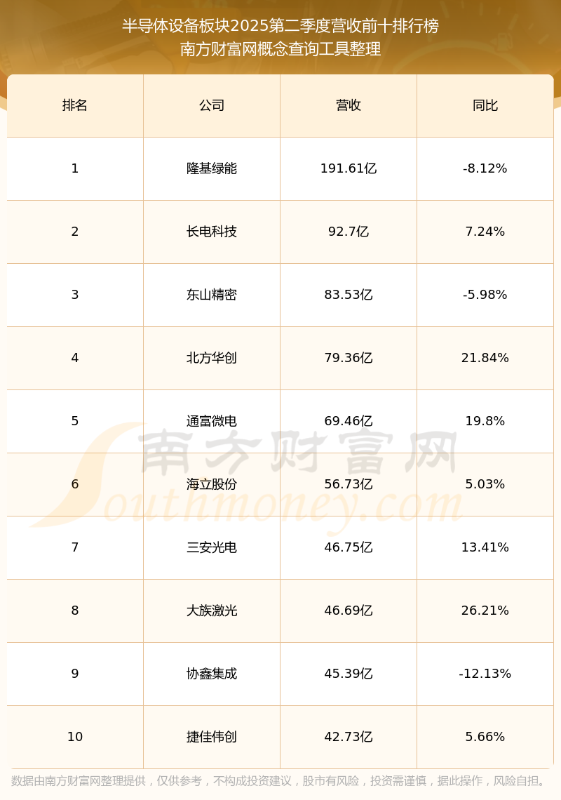 按照南方財(cái)富網(wǎng)概念查詢工具統(tǒng)計(jì),該股所屬板塊為半導(dǎo)體設(shè)備板塊,該板塊共有170只股票,金海通2025第二季度營(yíng)收在該板塊中排名為第132名,該板塊2025第二季度營(yíng)收排名前十的股票如下表: