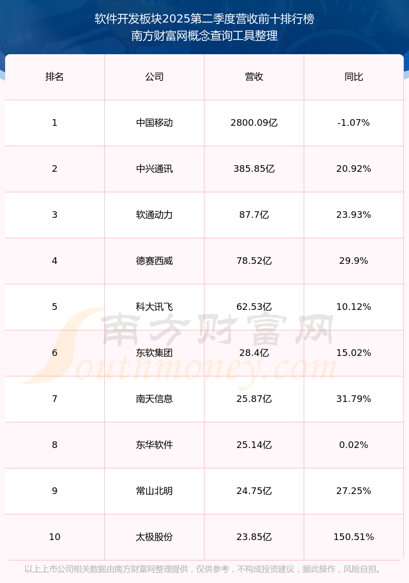 按照南方財富網(wǎng)概念查詢工具統(tǒng)計,該股所屬板塊為軟件開發(fā)板塊,該板塊共有196只股票,中科軟2025第二季度營收在該板塊中排名為第20名,該板塊2025第二季度營收排名前十的股票如下表: