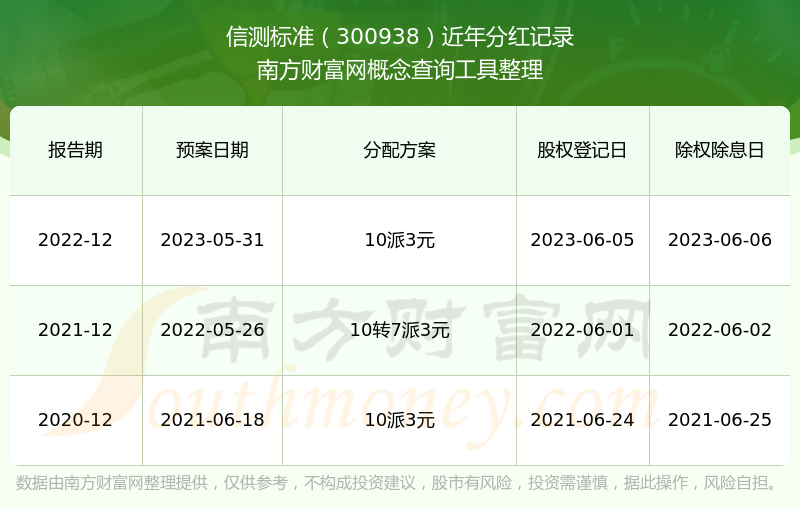 信測標準最新一次公布的分紅方案為10派3元。本次權(quán)益分派股權(quán)登記日為2023年6月5日,除權(quán)除息日為2023年6月6日,派息日為2023年6月6日。