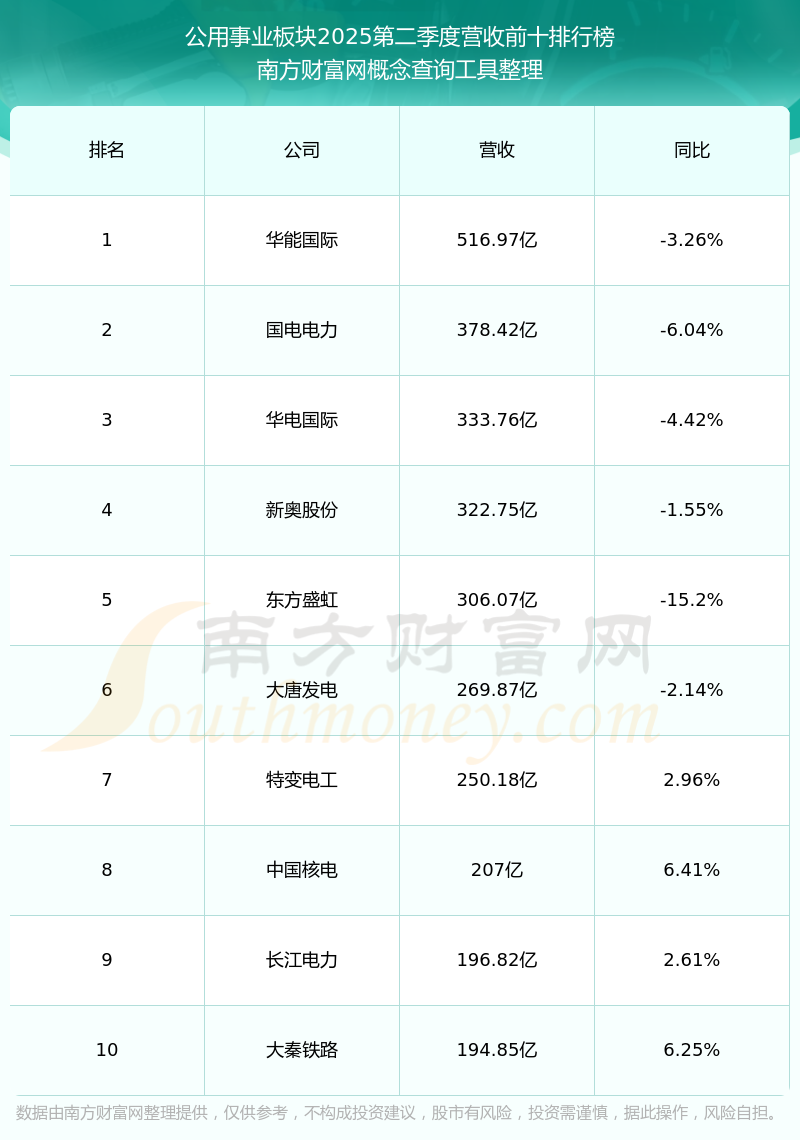 按照南方財(cái)富網(wǎng)概念查詢工具統(tǒng)計(jì),該股所屬板塊為公用事業(yè)板塊,該板塊共有190只股票,江南水務(wù)2025第二季度營(yíng)收在該板塊中排名為第152名,該板塊2025第二季度營(yíng)收排名前十的股票如下表: