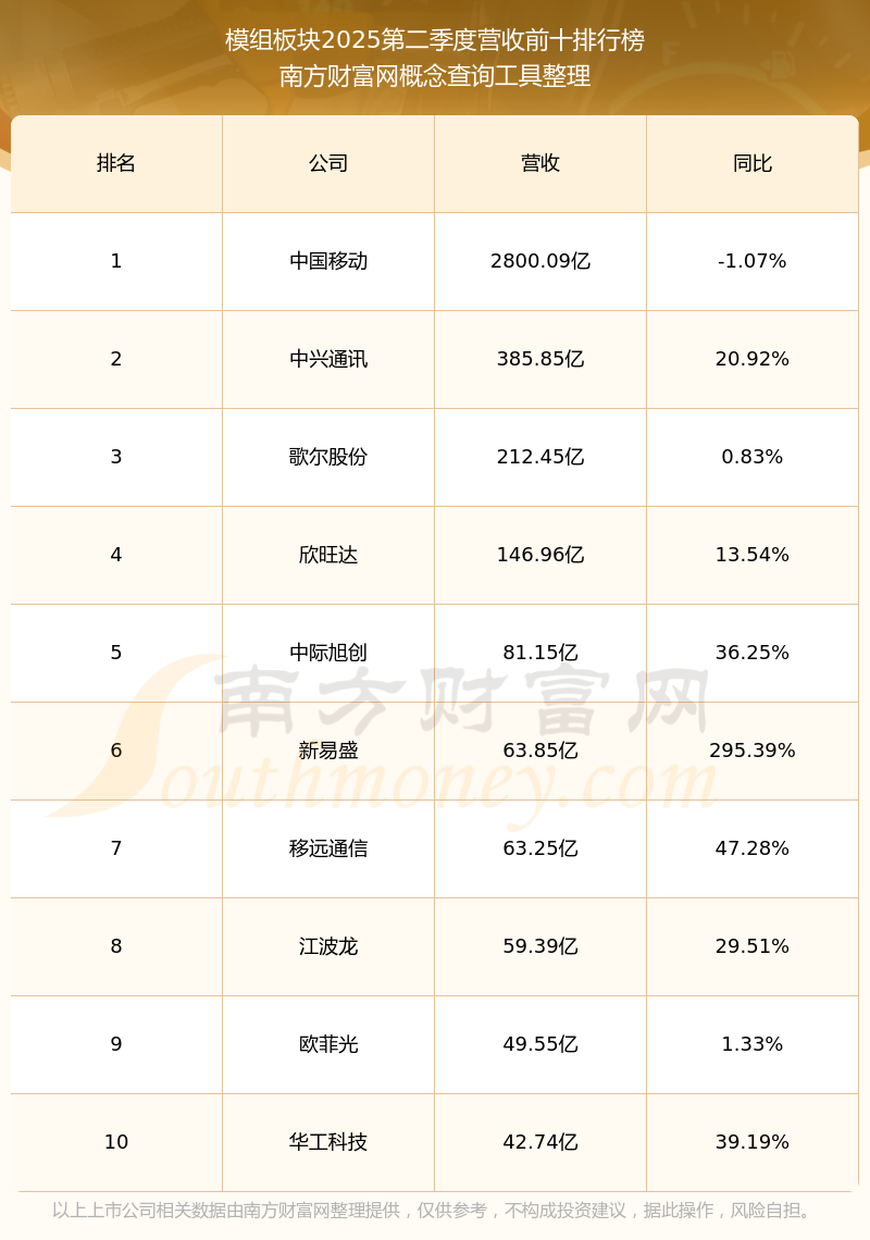 按照南方財(cái)富網(wǎng)概念查詢工具統(tǒng)計(jì),該股所屬板塊為模組板塊,該板塊共有34只股票,樂鑫科技2025第二季度營收在該板塊中排名為第34名,該板塊2025第二季度營收排名前十的股票如下表: