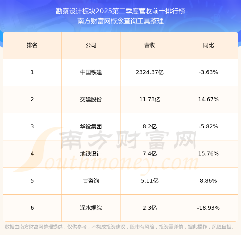 按照南方財(cái)富網(wǎng)概念查詢工具統(tǒng)計(jì),該股所屬板塊為勘察設(shè)計(jì)板塊,該板塊共有6只股票,華設(shè)集團(tuán)2025第二季度營收在該板塊中排名為第3名,該板塊2025第二季度營收排名前十的股票如下表: