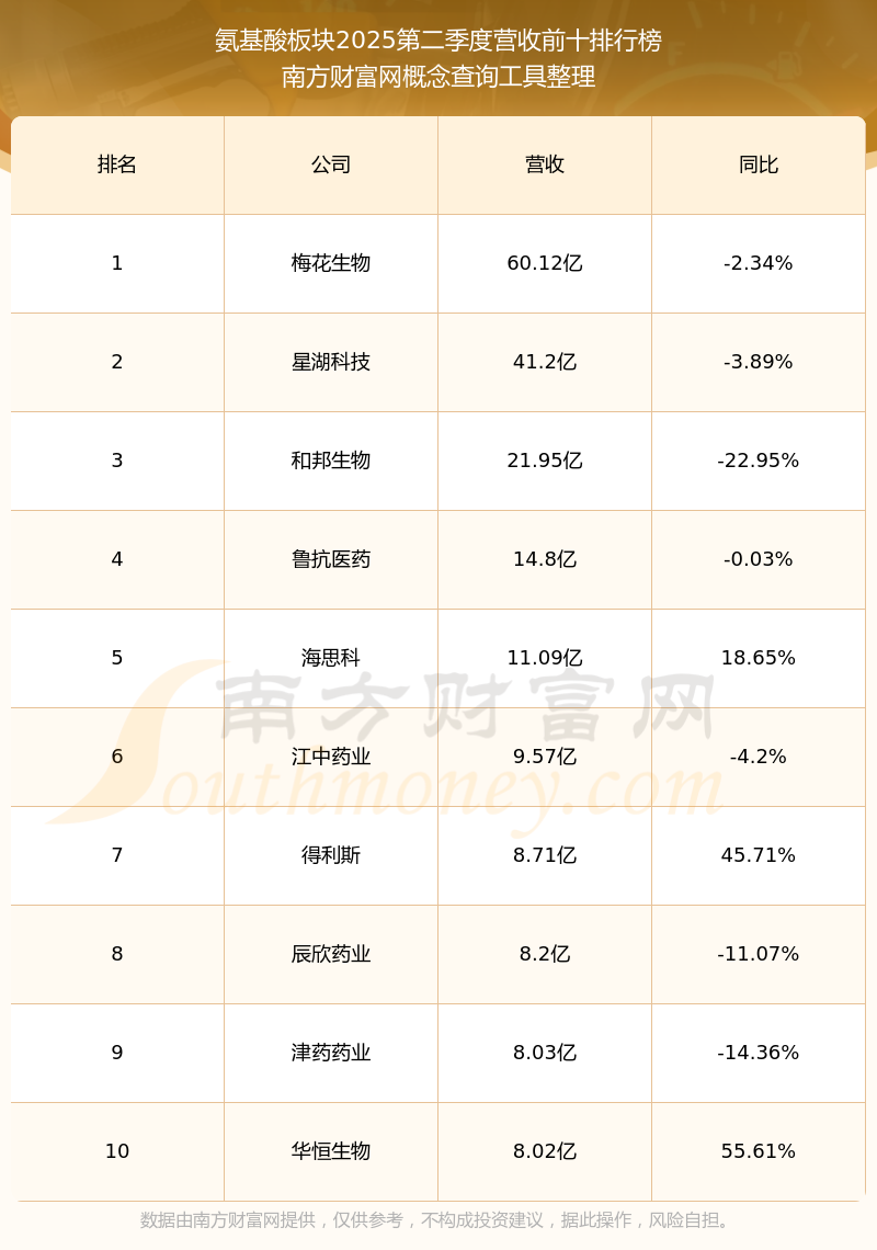 按照南方財(cái)富網(wǎng)概念查詢工具統(tǒng)計(jì),該股所屬板塊為氨基酸板塊,該板塊共有12只股票,華恒生物2025第二季度營收在該板塊中排名為第10名,該板塊2025第二季度營收排名前十的股票如下表: