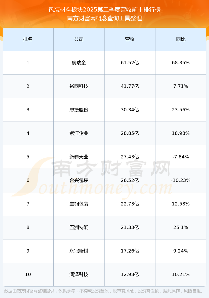 按照南方財(cái)富網(wǎng)概念查詢工具統(tǒng)計(jì),該股所屬板塊為包裝材料板塊,該板塊共有43只股票,東峰集團(tuán)2025第二季度營(yíng)收在該板塊中排名為第30名,該板塊2025第二季度營(yíng)收排名前十的股票如下表: