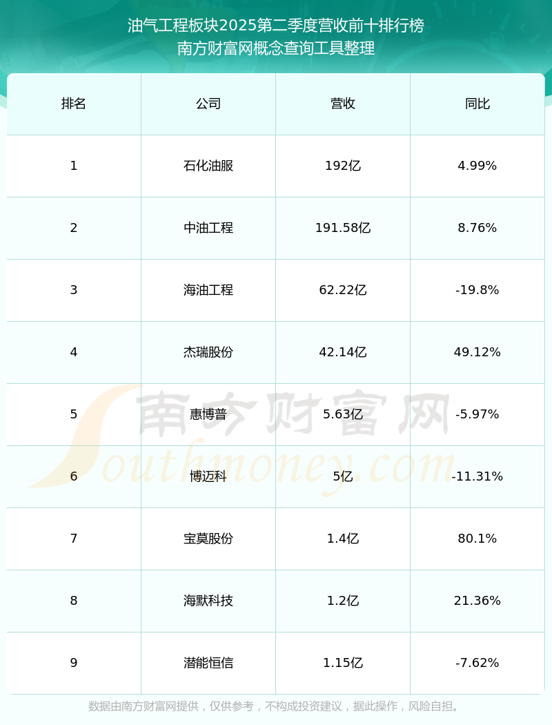按照南方財(cái)富網(wǎng)概念查詢工具統(tǒng)計(jì),該股所屬板塊為油氣工程板塊,該板塊共有9只股票,中油工程2025第二季度營(yíng)收在該板塊中排名為第2名,該板塊2025第二季度營(yíng)收排名前十的股票如下表: