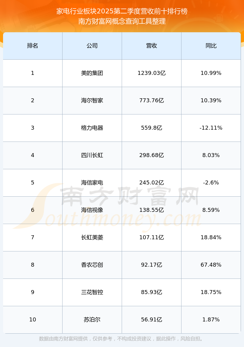 按照南方財(cái)富網(wǎng)概念查詢工具統(tǒng)計(jì),該股所屬板塊為家電行業(yè)板塊,該板塊共有64只股票,海信視像2025第二季度營收在該板塊中排名為第6名,該板塊2025第二季度營收排名前十的股票如下表: