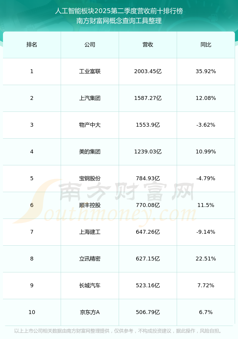 按照南方財(cái)富網(wǎng)概念查詢工具統(tǒng)計(jì),該股所屬板塊為人工智能板塊,該板塊共有967只股票,電子城2025第二季度營收在該板塊中排名為第568名,該板塊2025第二季度營收排名前十的股票如下表: