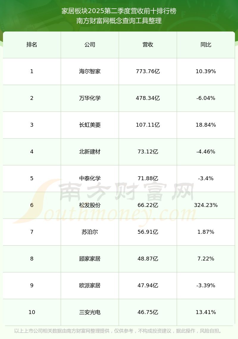 按照南方財(cái)富網(wǎng)概念查詢工具統(tǒng)計(jì),該股所屬板塊為家居板塊,該板塊共有166只股票,建霖家居2025第二季度營(yíng)收在該板塊中排名為第45名,該板塊2025第二季度營(yíng)收排名前十的股票如下表: