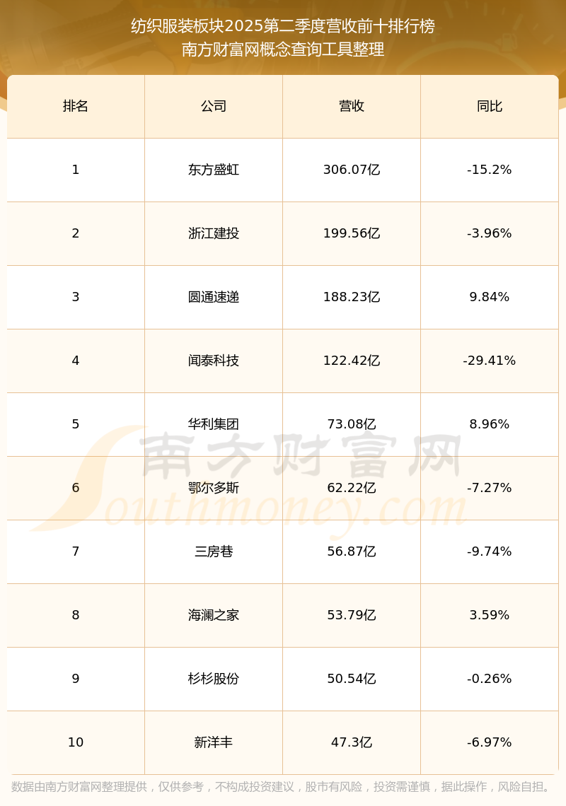 按照南方財富網(wǎng)概念查詢工具統(tǒng)計,該股所屬板塊為紡織服裝板塊,該板塊共有155只股票,太平鳥2025第二季度營收在該板塊中排名為第37名,該板塊2025第二季度營收排名前十的股票如下表: