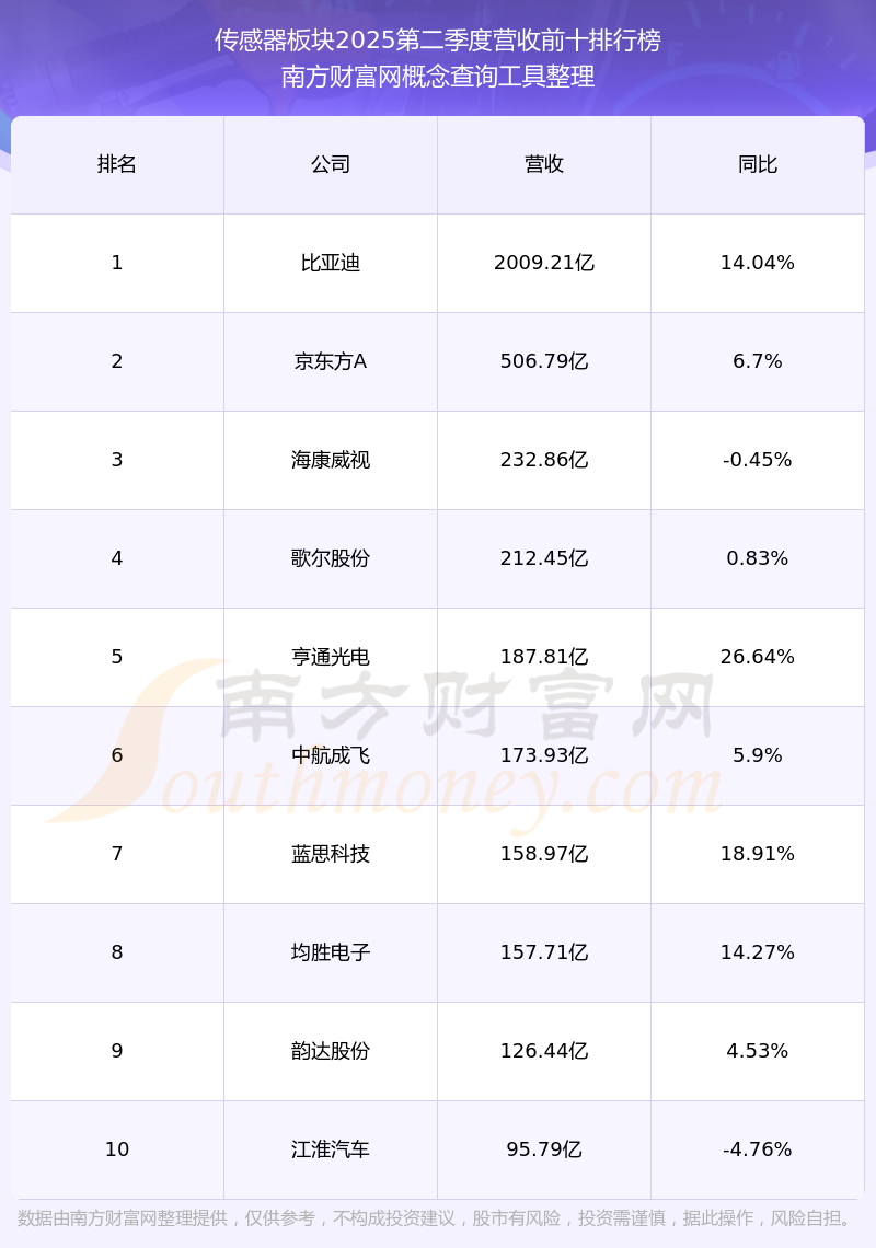 按照南方財(cái)富網(wǎng)概念查詢工具統(tǒng)計(jì),該股所屬板塊為傳感器板塊,該板塊共有177只股票,兆易創(chuàng)新2025第二季度營(yíng)收在該板塊中排名為第29名,該板塊2025第二季度營(yíng)收排名前十的股票如下表: