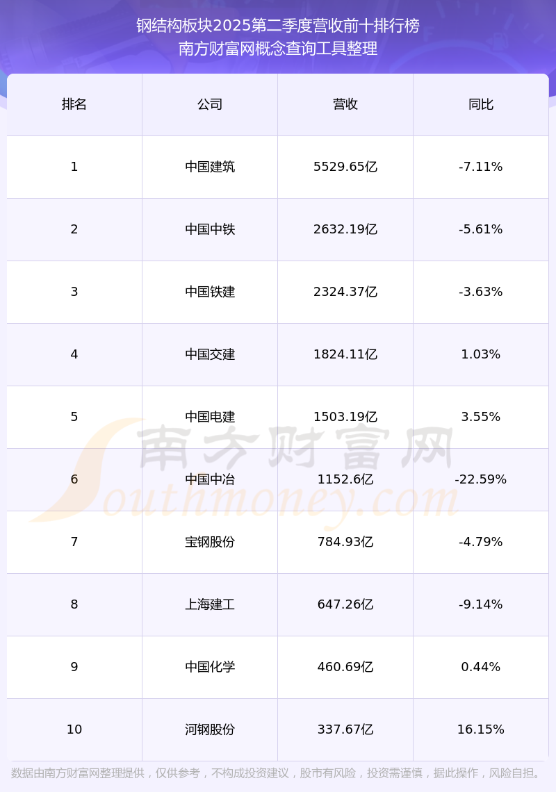 按照南方財(cái)富網(wǎng)概念查詢工具統(tǒng)計(jì),該股所屬板塊為鋼結(jié)構(gòu)板塊,該板塊共有46只股票,中船防務(wù)2025第二季度營收在該板塊中排名為第46名,該板塊2025第二季度營收排名前十的股票如下表: