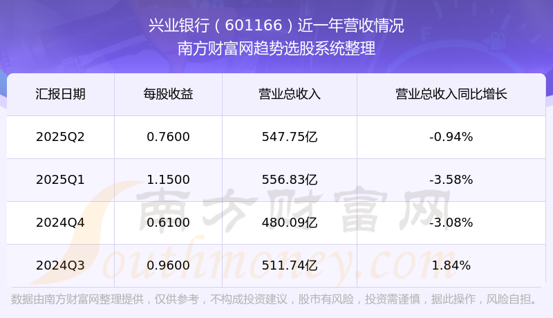 財(cái)報(bào)顯示,2025年第二季度興業(yè)銀行營收547.75億元,同比增長(zhǎng)-0.94%,凈利潤193.45億元,同比增長(zhǎng)3.38%。