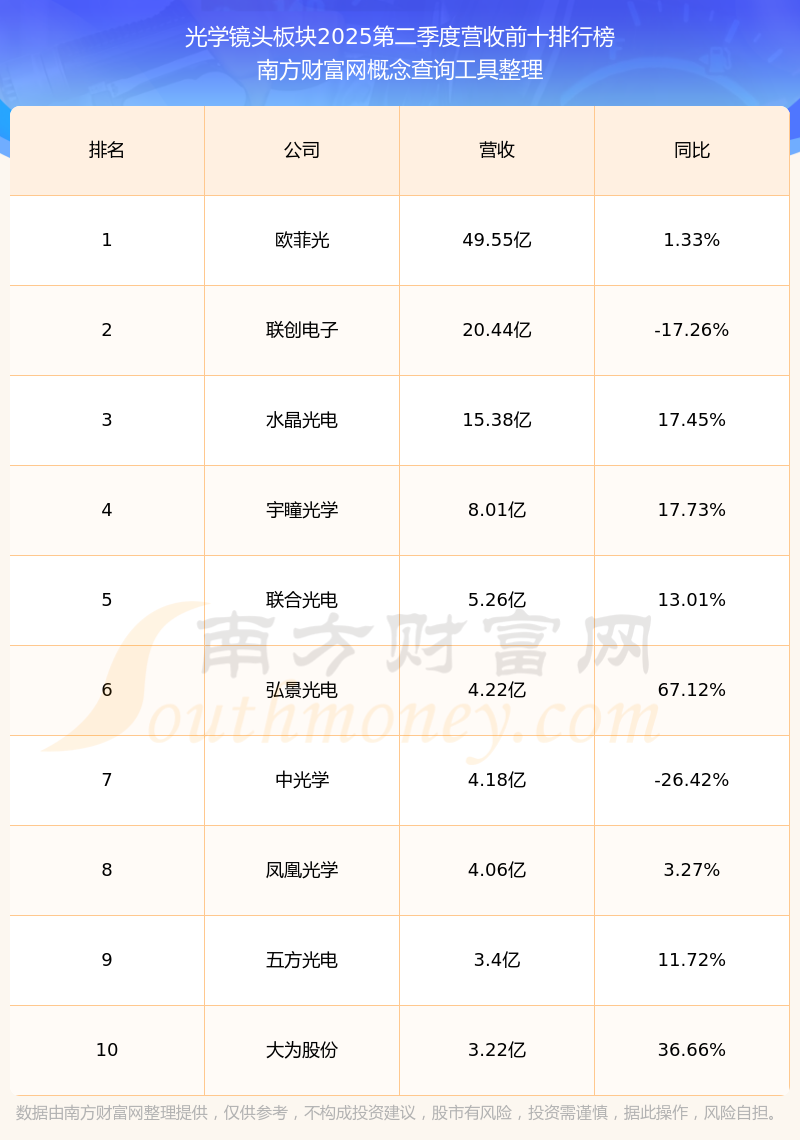 按照南方財(cái)富網(wǎng)概念查詢工具統(tǒng)計(jì),該股所屬板塊為光學(xué)鏡頭板塊,該板塊共有19只股票,中潤(rùn)光學(xué)2025第二季度營(yíng)收在該板塊中排名為第17名,該板塊2025第二季度營(yíng)收排名前十的股票如下表: