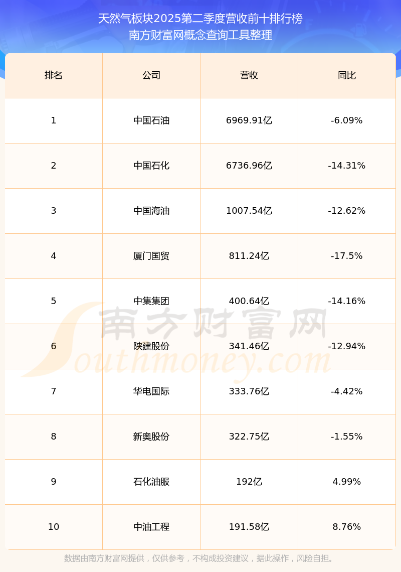 按照南方財富網(wǎng)概念查詢工具統(tǒng)計(jì),該股所屬板塊為天然氣板塊,該板塊共有154只股票,藍(lán)天燃?xì)?025第二季度營收在該板塊中排名為第79名,該板塊2025第二季度營收排名前十的股票如下表: