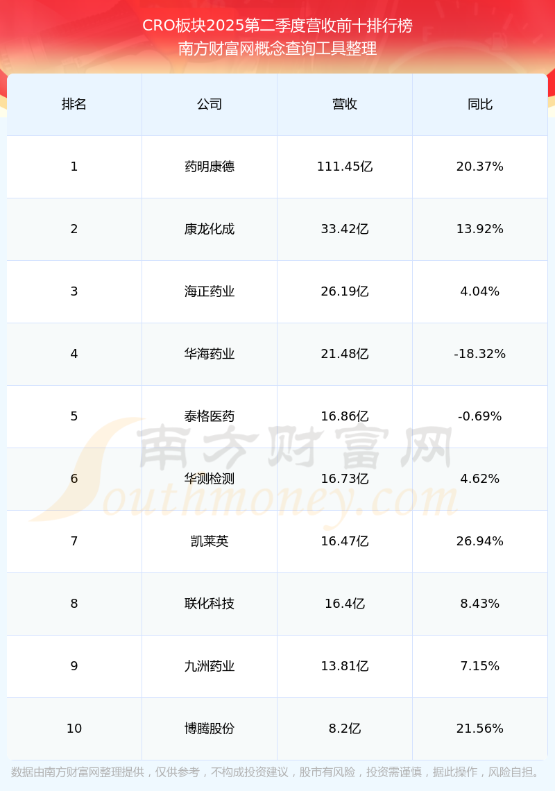 按照南方財富網概念查詢工具統(tǒng)計,該股所屬板塊為CRO板塊,該板塊共有45只股票,益諾思2025第二季度營收在該板塊中排名為第34名,該板塊2025第二季度營收排名前十的股票如下表: