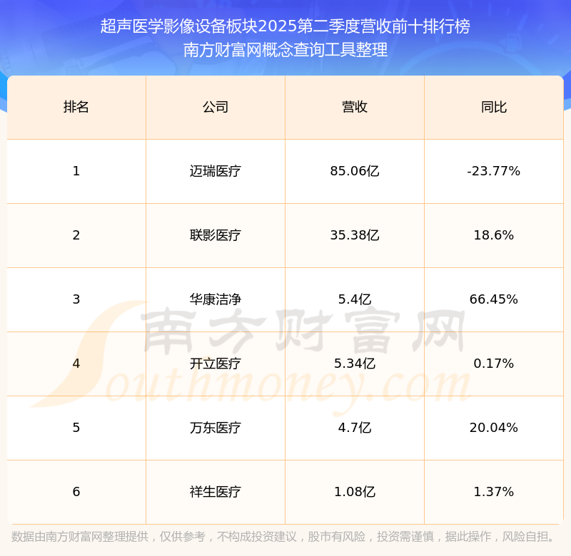 按照南方財(cái)富網(wǎng)概念查詢工具統(tǒng)計(jì),該股所屬板塊為超聲醫(yī)學(xué)影像設(shè)備板塊,該板塊共有6只股票,祥生醫(yī)療2025第二季度營收在該板塊中排名為第6名,該板塊2025第二季度營收排名前十的股票如下表: