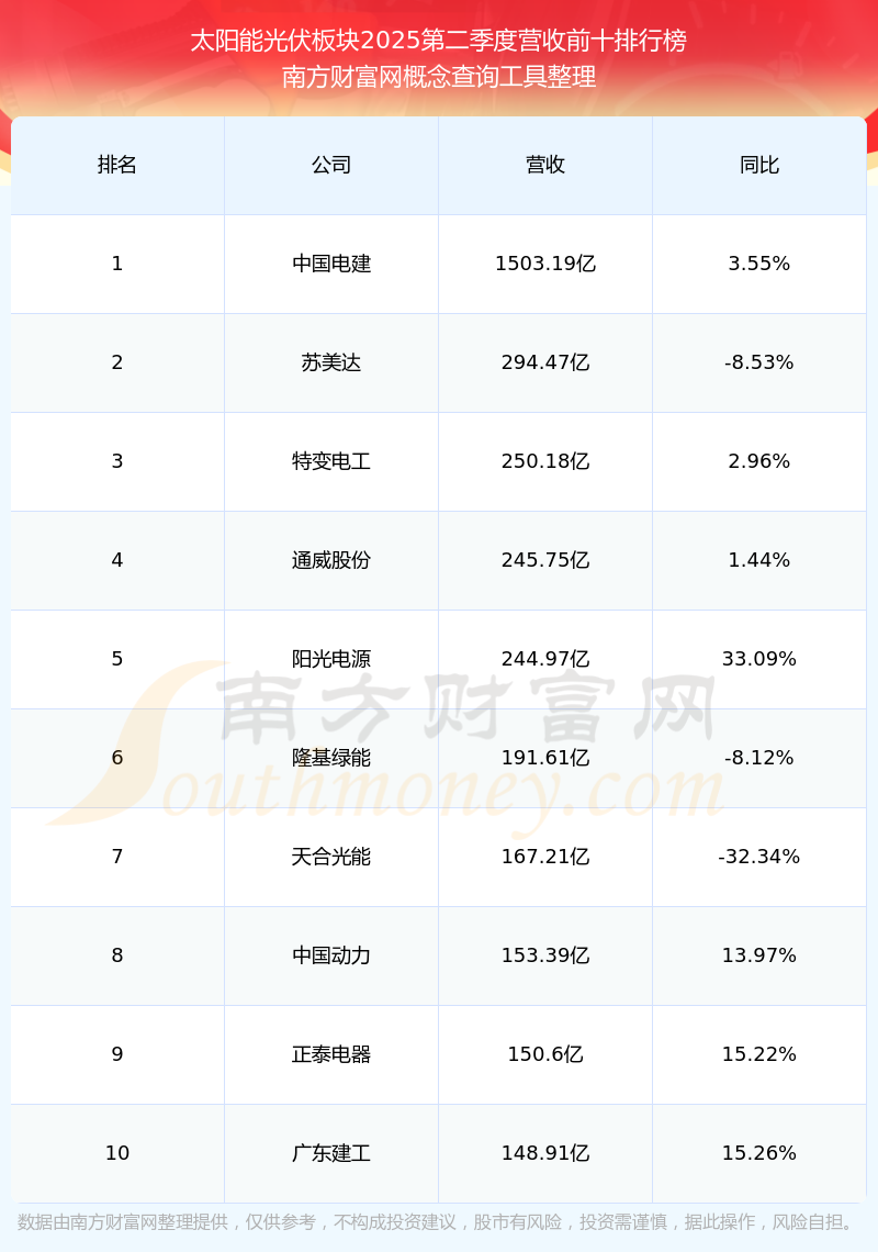 按照南方財富網(wǎng)概念查詢工具統(tǒng)計,該股所屬板塊為太陽能光伏板塊,該板塊共有120只股票,正帆科技2025第二季度營收在該板塊中排名為第120名,該板塊2025第二季度營收排名前十的股票如下表: