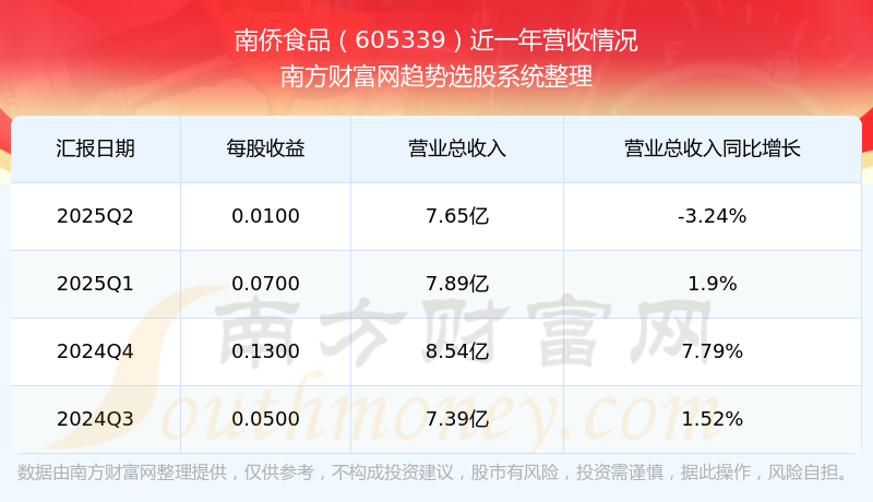南僑食品2025年第二季度顯示,公司主營收入7.65億元,同比-3.24%;歸母凈利潤699.76萬元,同比-86.49%;扣非凈利潤583.36萬元,同比-88.07%;