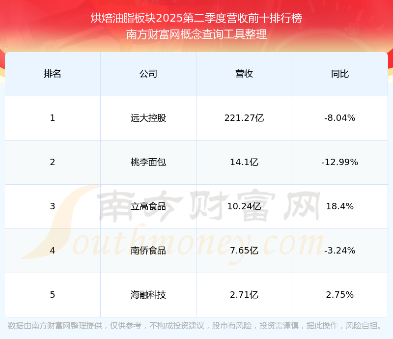 按照南方財富網(wǎng)概念查詢工具統(tǒng)計,該股所屬板塊為烘焙油脂板塊,該板塊共有5只股票,南僑食品2025第二季度營收在該板塊中排名為第4名,該板塊2025第二季度營收排名前十的股票如下表: