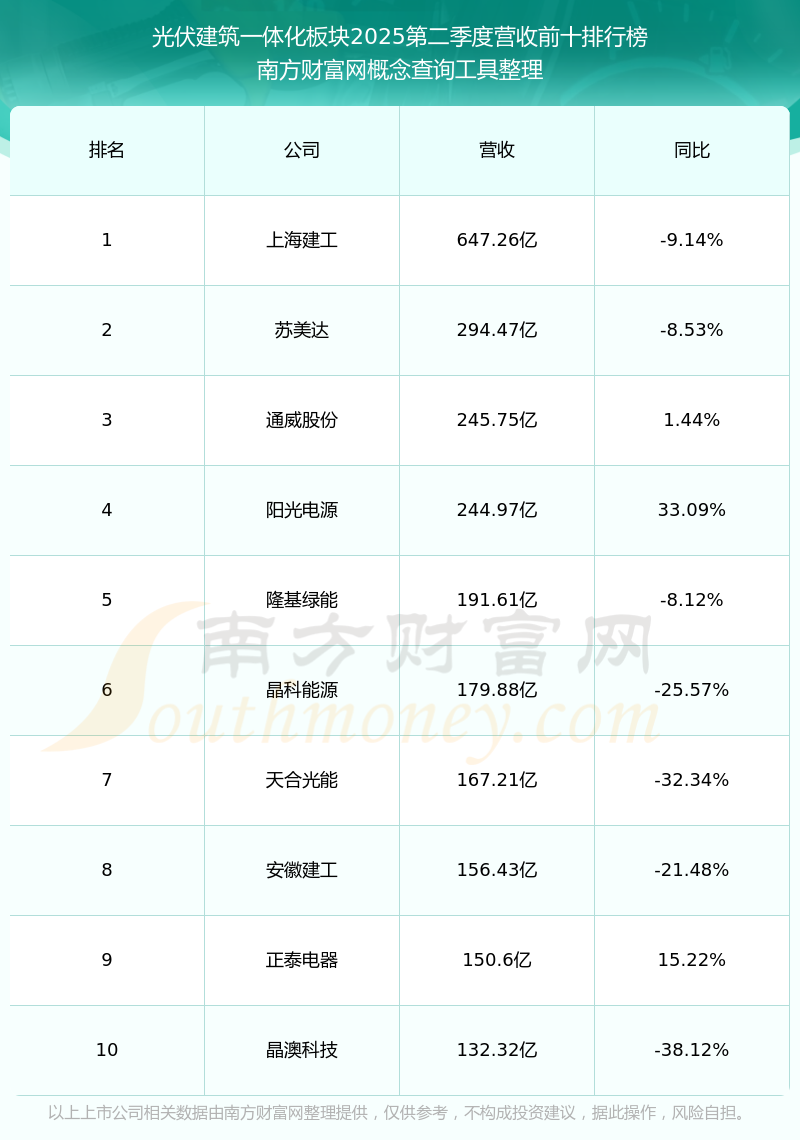 按照南方財富網(wǎng)概念查詢工具統(tǒng)計,該股所屬板塊為光伏建筑一體化板塊,該板塊共有87只股票,正泰電器2025第二季度營收在該板塊中排名為第9名,該板塊2025第二季度營收排名前十的股票如下表:
