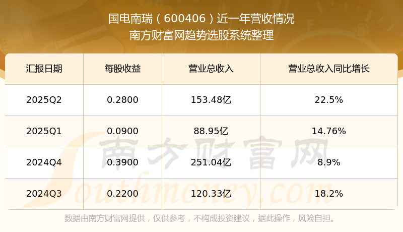于2025年第二季度,國電南瑞披露了其業(yè)績表現(xiàn),其中主營業(yè)務(wù)收入153.48億元,相較于去年同期22.5%。此外,公司歸屬于母公司的凈利潤為22.72億元,同比增長了7.33%。在扣除所有非經(jīng)常性損益后,凈利潤21.95億元,同比增長5.84%。