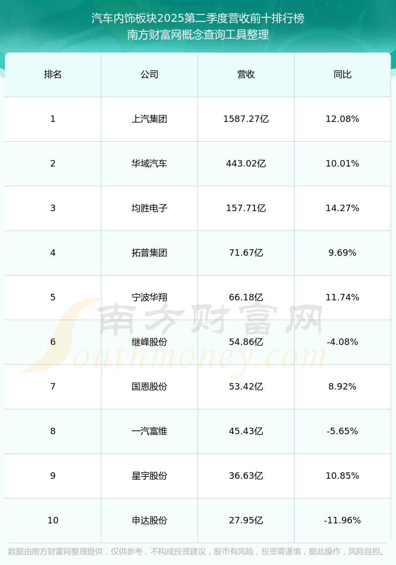 按照南方財(cái)富網(wǎng)概念查詢工具統(tǒng)計(jì),該股所屬板塊為汽車內(nèi)飾板塊,該板塊共有32只股票,申達(dá)股份2025第二季度營(yíng)收在該板塊中排名為第10名,該板塊2025第二季度營(yíng)收排名前十的股票如下表: