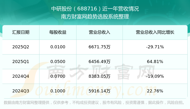 中研股份2025年第二季度財報顯示,公司主營收入6671.75萬元,同比-29.71%;歸母凈利潤136.68萬元,同比-92.16%;扣非凈利潤-48.74萬元,同比-103%。