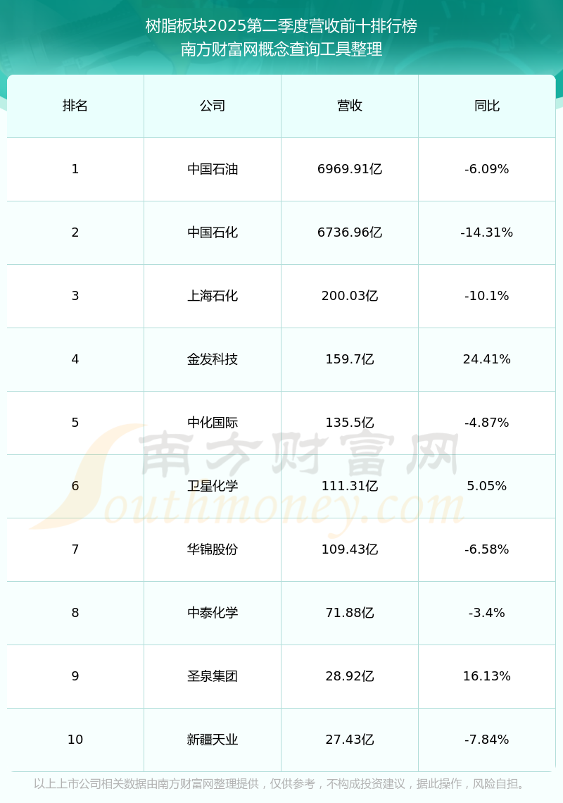 按照南方財富網(wǎng)概念查詢工具統(tǒng)計,該股所屬板塊為樹脂板塊,該板塊共有33只股票,中研股份2025第二季度營收在該板塊中排名為第33名,該板塊2025第二季度營收排名前十的股票如下表: