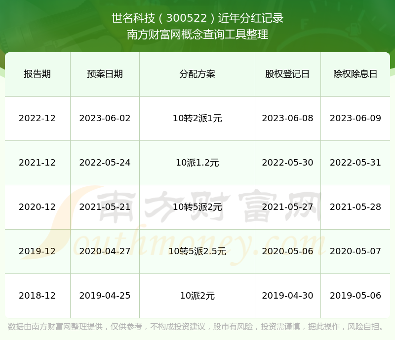 世名科技最新一次公布的分紅方案為10轉(zhuǎn)2派1元。本次權(quán)益分派股權(quán)登記日為2023年6月8日,除權(quán)除息日為2023年6月9日,派息日為2023年6月9日。