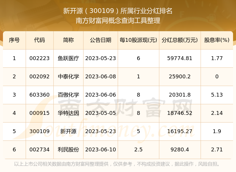 按照南方財富網(wǎng)趨勢選股系統(tǒng)統(tǒng)計,新開源所屬行業(yè)為化學制品行業(yè),化學制品行業(yè)分紅排名情況如下表: