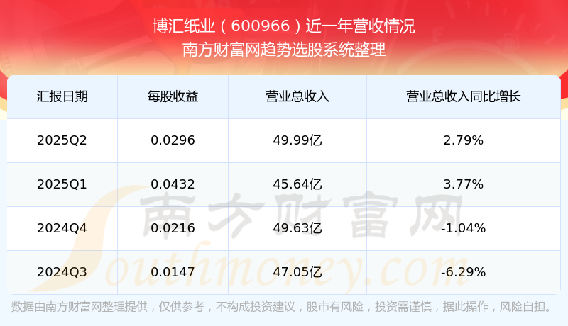博匯紙業(yè)2025年第二季度顯示,公司主營(yíng)收入49.99億元,同比2.79%;歸母凈利潤(rùn)3664.77萬(wàn)元,同比20.09%;扣非凈利潤(rùn)612.16萬(wàn)元,同比-57.3%;