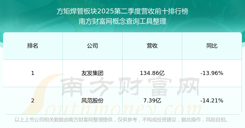 按照南方財(cái)富網(wǎng)概念查詢工具統(tǒng)計(jì),該股所屬板塊為方矩焊管板塊,該板塊共有2只股票,友發(fā)集團(tuán)2025第二季度營收在該板塊中排名為第1名,該板塊2025第二季度營收排名前十的股票如下表: