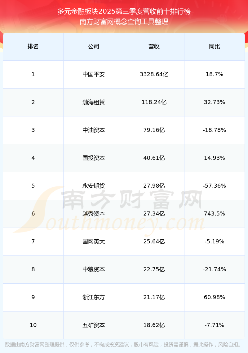 按照南方財富網(wǎng)概念查詢工具統(tǒng)計,該股所屬板塊為多元金融板塊,該板塊共有35只股票,熊貓金控2025第三季度營收在該板塊中排名為第30名,該板塊2025第三季度營收排名前十的股票如下表: