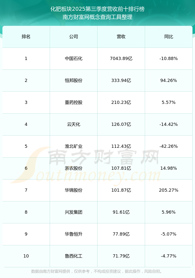 按照南方財富網(wǎng)概念查詢工具統(tǒng)計,該股所屬板塊為化肥板塊,該板塊共有83只股票,湖南海利2025第三季度營收在該板塊中排名為第83名,該板塊2025第三季度營收排名前十的股票如下表: