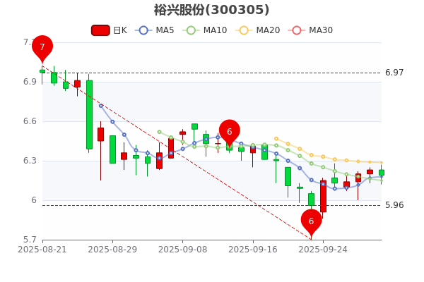10月9日上午收盤消息,裕興股份開盤報(bào)價(jià)6.23元,收盤于6.190元。7日內(nèi)股價(jià)上漲2.25%,總市值為23.24億元。