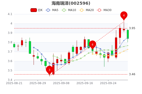 10月9日收盤消息,海南瑞澤最新報價3.840元,跌2.54%,3日內(nèi)股價下跌2.86%;今年來漲幅上漲7.81%,市盈率為-18.29。