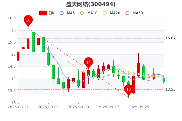 盛天網(wǎng)絡(luò)(300494)跌1.91%,報13.820元,成交額7037.27萬元,換手率1.27%,振幅跌2.33%。