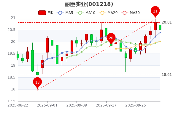 截止10月10日10時(shí)13分,麗臣實(shí)業(yè)(001218)跌1.49%,股價(jià)為20.640元,盤中股價(jià)最高觸及20.75元,最低達(dá)20.36元,總市值26.87億元。